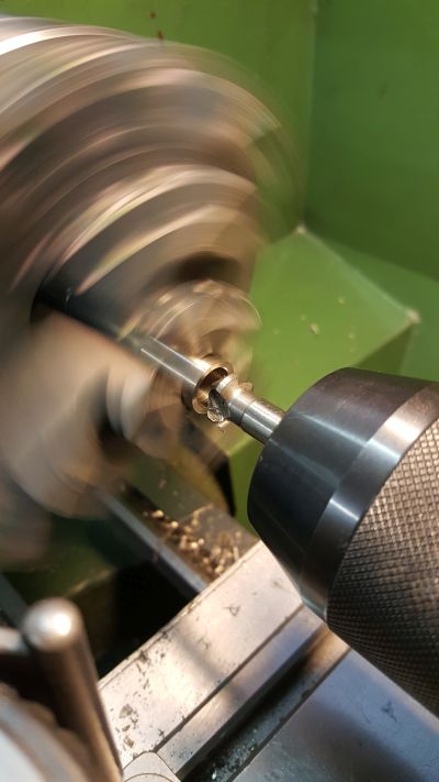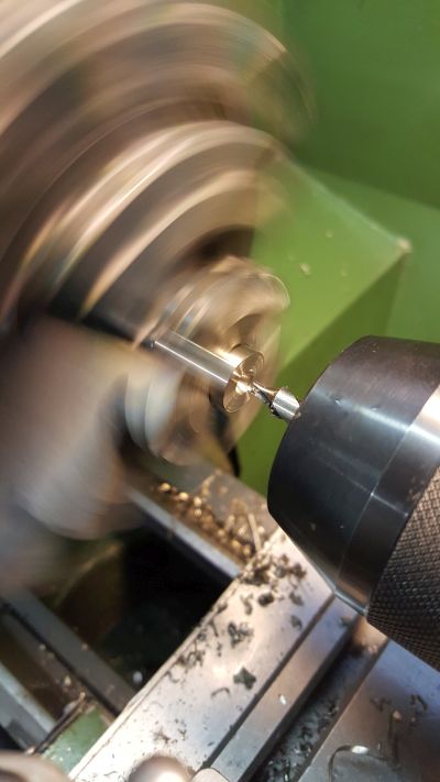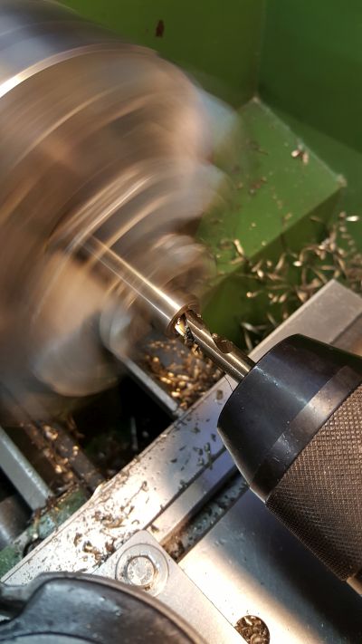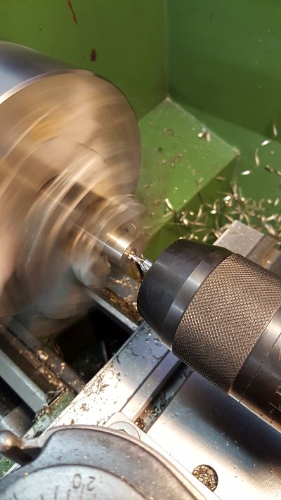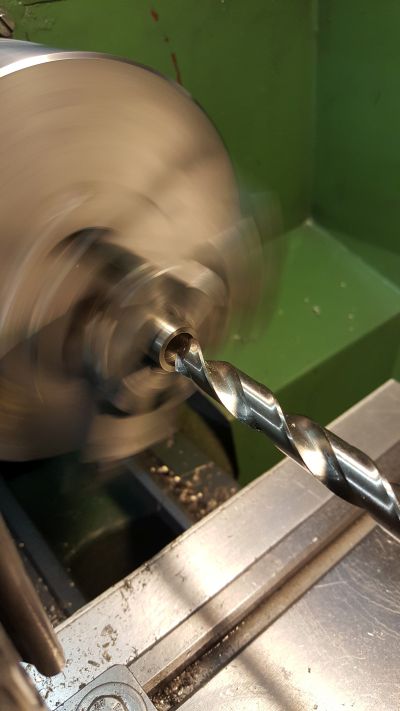Hier wird gerade die Zentrierung für die Längsbohrung des Grundkörpers eingebracht. |